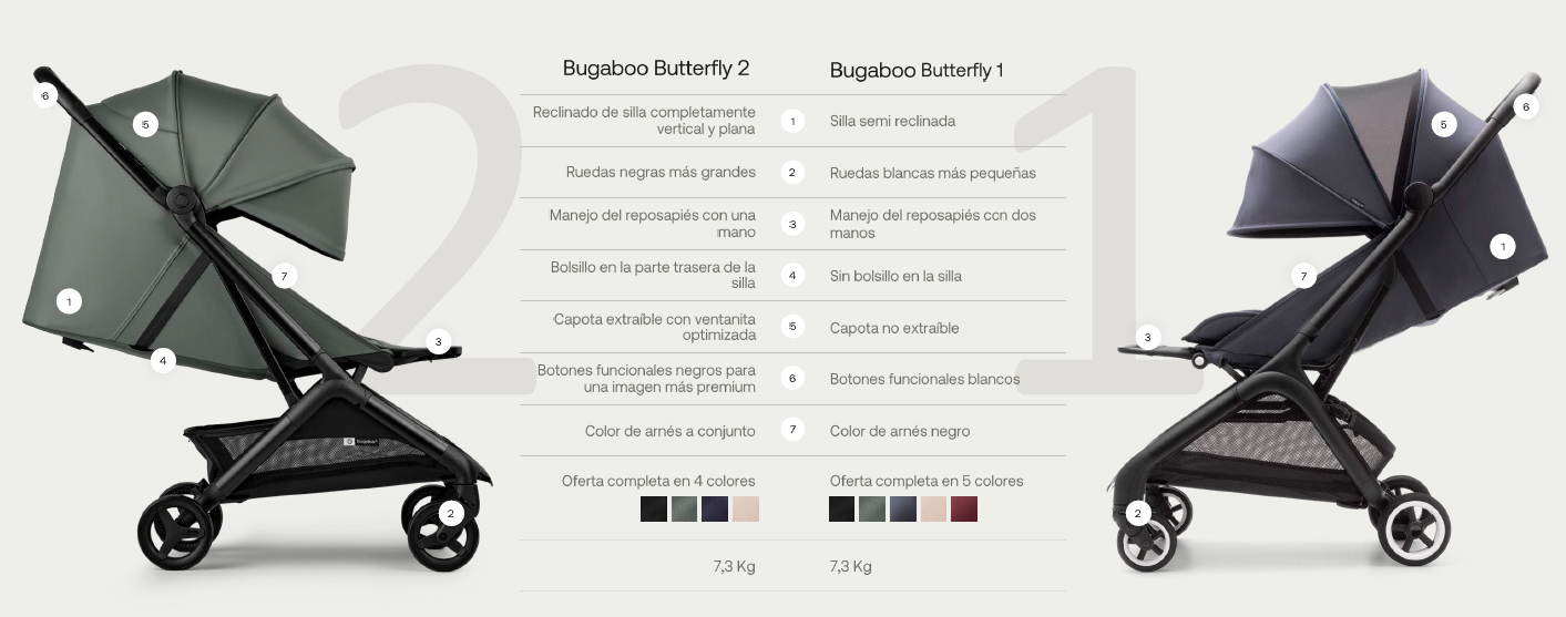 Bugaboo Butterfly 2 es una silla de paseo compacta y ligera. Se pliega en solo 1segundo y sus medidas valen como equipaje de mano para viajar en avión.